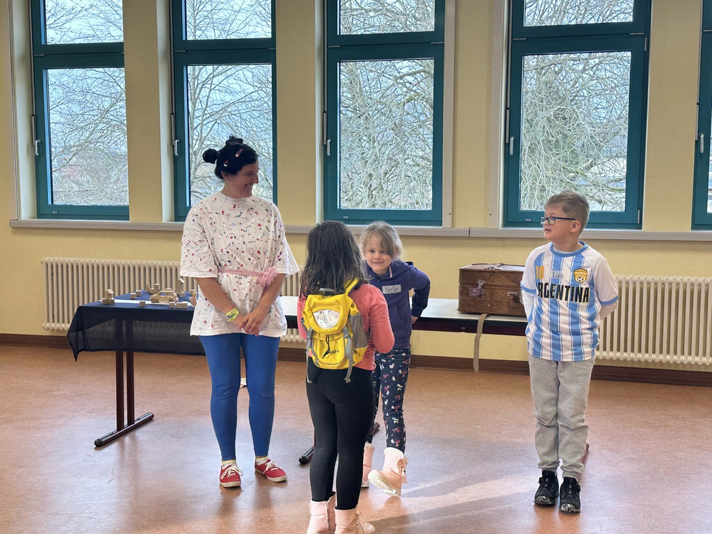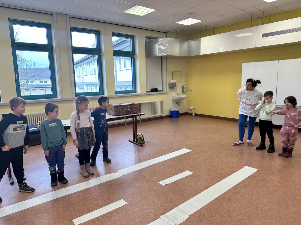 In einem anschaulichen und zugleich unterhaltsamen Theaterstück vermittelte Frau Barbara Zeltinger den Kindern auf kindgerechte Weise die Bedeutung grundlegender Verhaltensregeln im Alltag. Thematische Schwerpunkte bildeten dabei unter anderem die Kommunikation mit den Eltern, insbesondere dass ein Elternteil stets darüber informiert sein sollte, wo sich das Kind aufhält und welche Vorhaben es verfolgt, das sichere Verhalten im Straßenverkehr sowie das richtige Vorgehen beim Kontaktieren der Polizei. Durch die spielerische und humorvolle Darbietung fiel es den Kindern leicht, sich in die dargestellten Rollen hineinzuversetzen und die vermittelten Inhalte nachhaltig aufzunehmen. Im Anschluss erhielten sie zudem die Möglichkeit, selbst aktiv zu werden und sich in einem kleinen Theaterspiel auszuprobieren, was auf große Begeisterung stieß.
